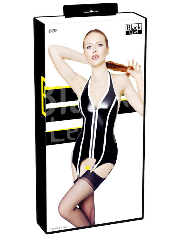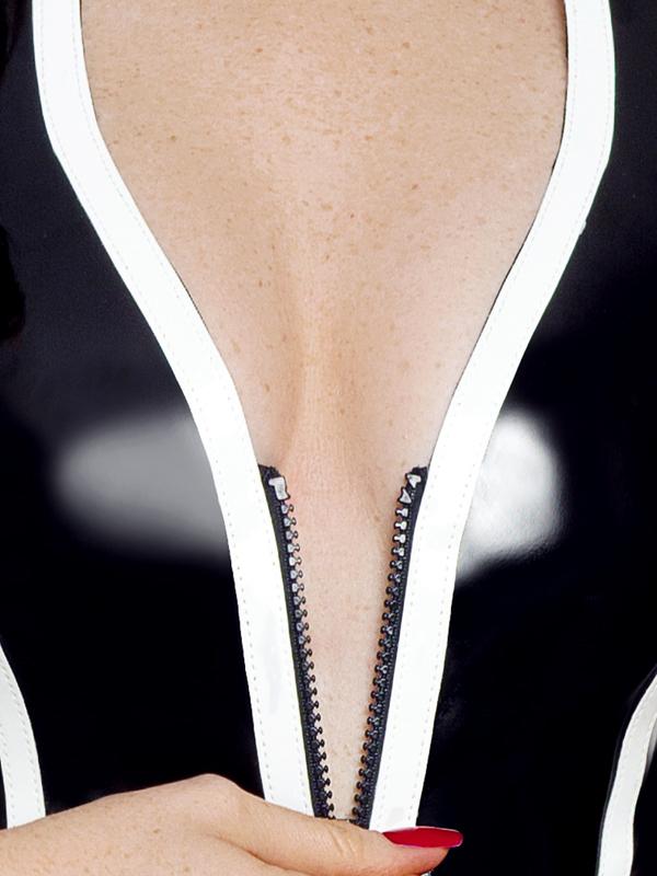 Una vera Gangster sex! Romantico Basque bianco e nero realizzato in vinile, con cerniera a tutta lunghezza sul davanti. Aperto nella schiena – allacciatura al collo con chiusura a strappo Strisce hot per curve sexy! Il sensazionale basque è fatto di vinile nero lucido. Ha anche eleganti dettagli e strisce in vinile bianco. Nella parte anteriore è presente una pratica cerniera su tutta la lunghezza. Inoltre ha la schiena libera ed una allacciatura al collo con chiusura a strappo. Le 4 bretelle metalliche (clip) sono cucite. 100% poliestere, rivestimento in poliuretano. Senza calze.