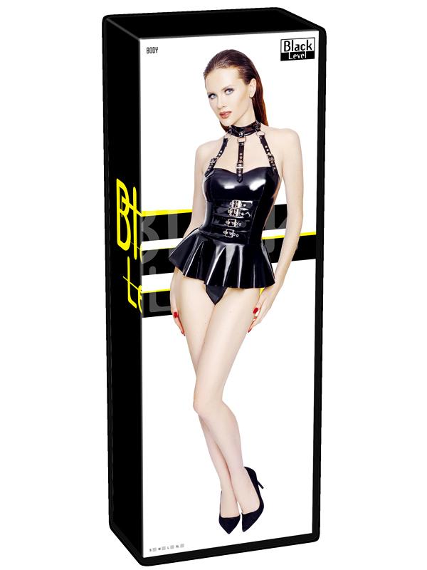 Stupendo body in vinile con gonna attaccata Design aderente Cinghie con fibbia regolabili Colletto allacciato, regolabile Cerniera sul retro Rigoroso - e comunque giocoso! Body sofisticato con gonna svasata attaccata, interamente realizzata in vinile nero lucido. È aderente e dispone di 3 cinturini con fibbia regolabili nella zona della scollatura che conducono al colletto, regolabile con due bottoni a pressione. La parte anteriore ha 4 cinturini con fibbia per evidenziare la vita. Eccitante la schiena: la cerniera incorporata sul retro è fissata con un bottone a pressione. 100% poliestere, rivestimento in poliuretano.