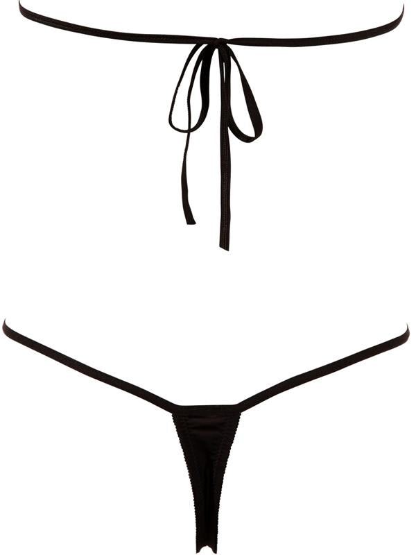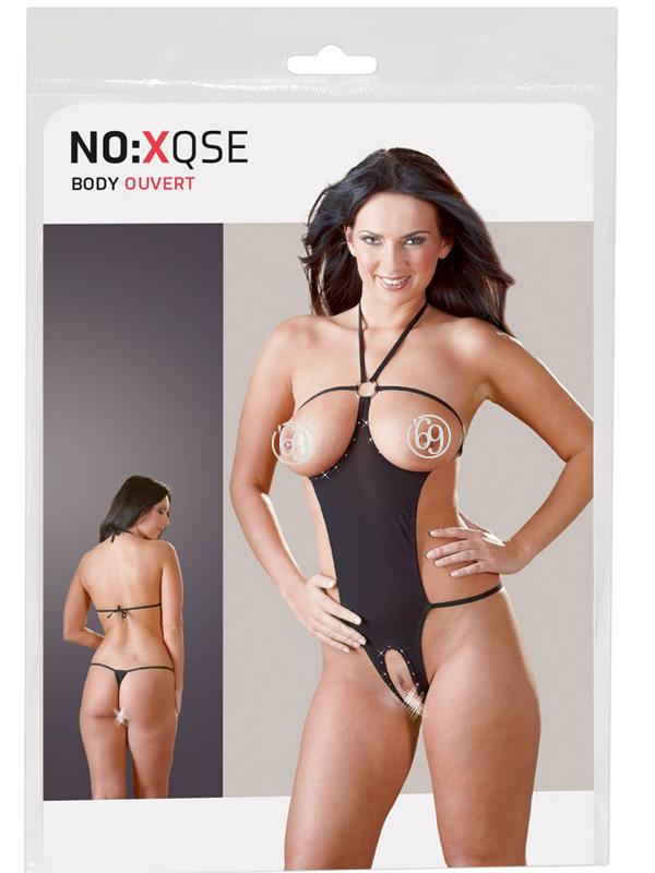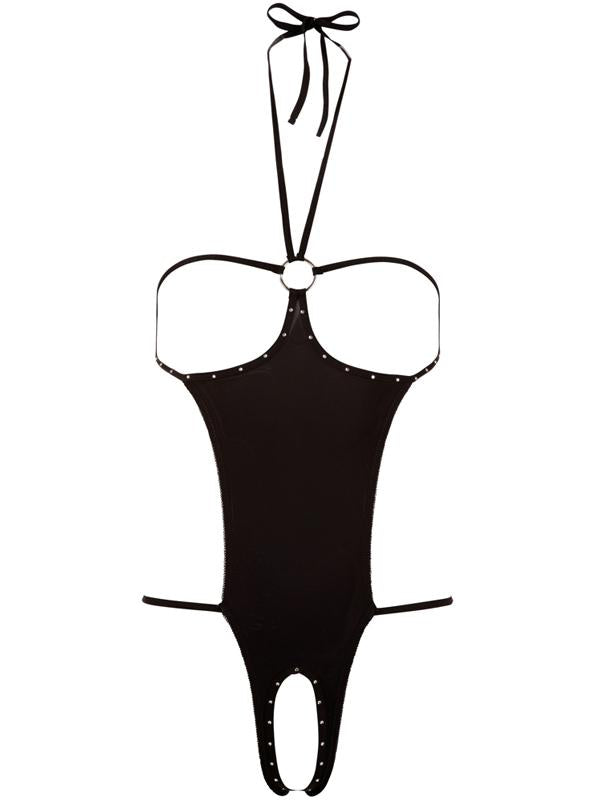 Provocante body monopezzo con neckholder da legare e decorazione di strass sulle coppe scoperte e sull'apertura all'inguine. Visto da davanti sembra un comunissimo body, forse solo un po' più provocante, ma da dietro si trasforma e diventa un completo intimo vero e proprio, con laccetto per il reggiseno e string molto sottile. 85% poliammide, 15% elastan.
