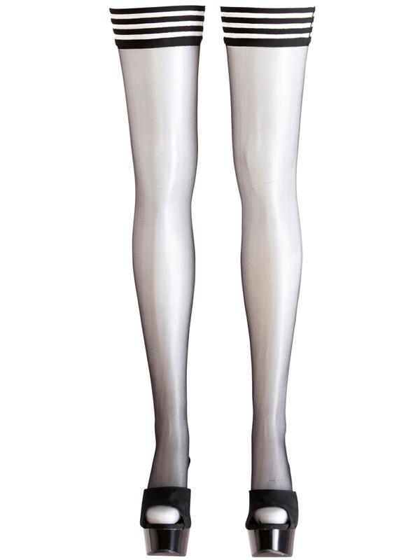 Calze autoreggenti a righe orizzontali nere nella parte superiore. Fili di silicone posizionati all'interno ne garantiscono una tenuta perfetta. Senza reggicalze con rinforzo di silicone sulla balza per una tenuta antiscivolo. Nero, provocante a righe. Con certificazione Oeko-Tex. 90% poliammide, 10% elastan.