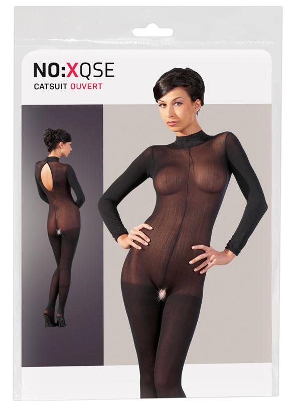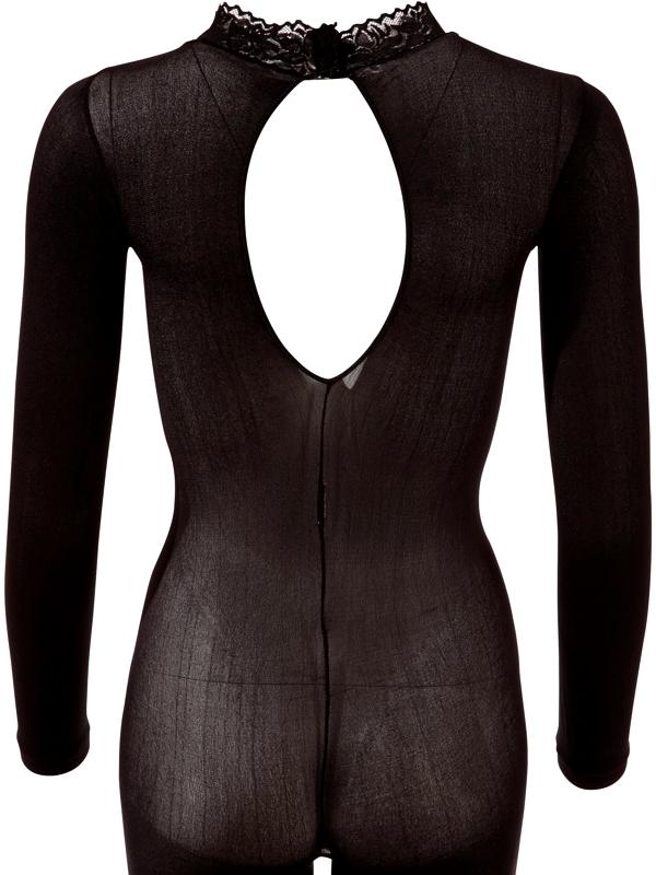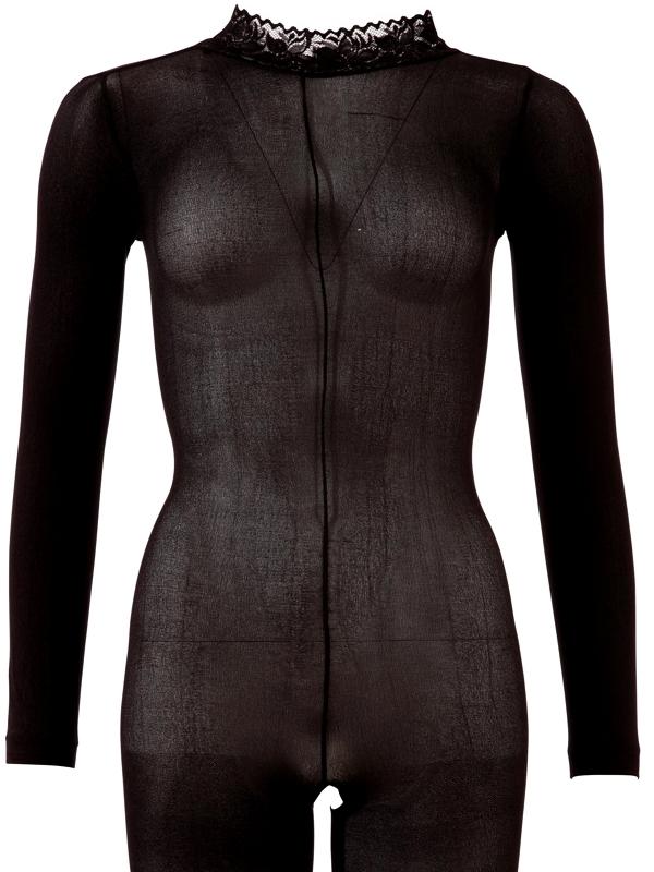 Catsuit in leggero tessuto semi-trasparente e collo alto in pizzo. Ha manica lunga e apertura sul cavallo. Trasparenza nera con apertura all‘inguine. Colletto di pizzo con bottoni a pressione. Con piede. 100% poliammide