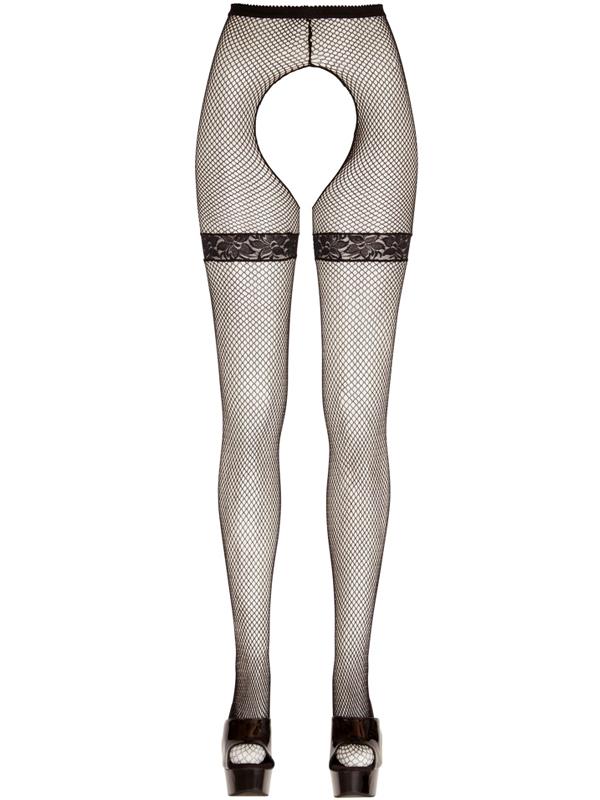Gambe estremamente sexy! Collant per reggicalze in tessuto a maglia grossa con reggicalze in pizzo cucite. Cavallo invitantemente aperto. 90% poliammide, 10% elastan.