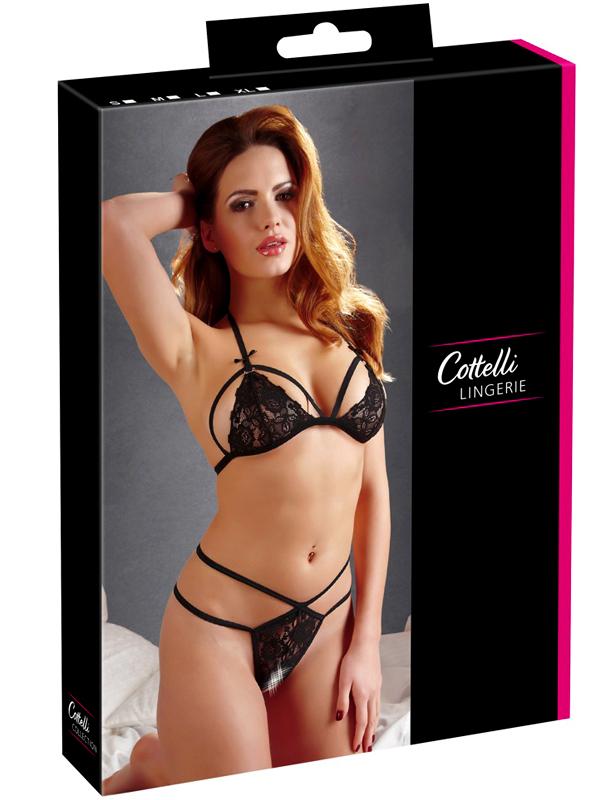 Molto intrigante, elegante ed erotico! Reggiseno con allacciatura dietro al collo e coppette apribili che lasciano il seno completamente nudo! Perizoma con doppia fascetta elastica e piccante apertura sul davanti. 100% poliammide.