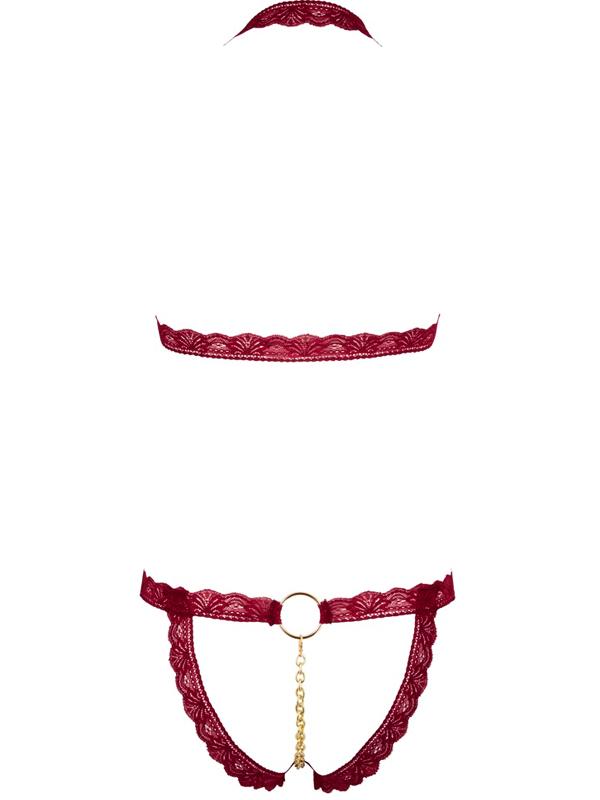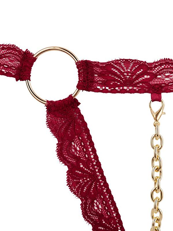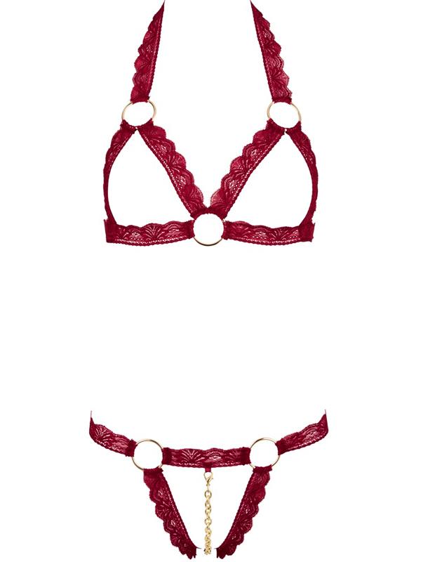 L'Offensiva della Seduzione! Set reggiseno in pizzo elastico con anelli metallici decorativi. Le coppe sono completamente aperte, la corda si presenta con una catena rimovibile attraverso il cavallo aperto (moschettone ad ogni estremità). 90% poliammide, 10% elastan.