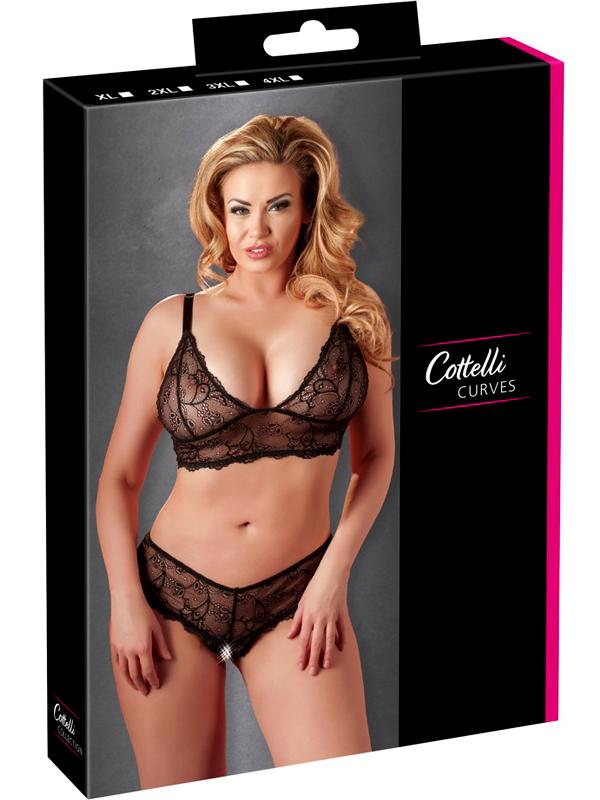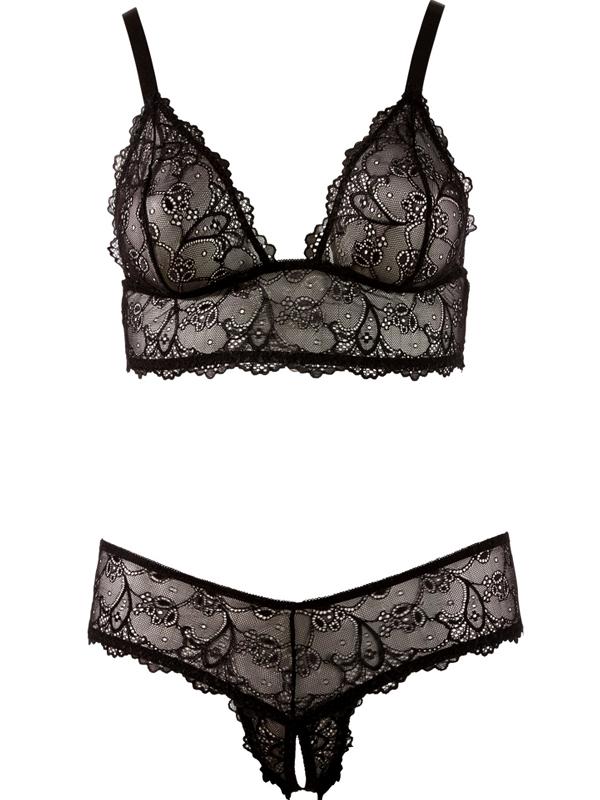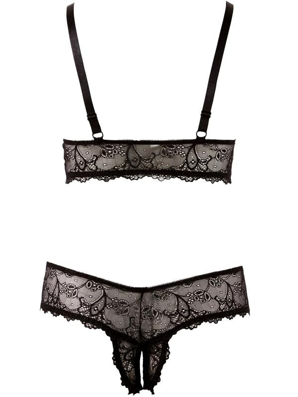 Delizioso e sexy, questo completino esalterà le tue forme e ti regalerà momenti di complicità! Reggiseno senza ferretto con bretelline regolabili ma senza chiusura. Include un elegante G string senza cucitura. Entrambe sono fatte completamente di pizzo. Materiale: 90% poliammide, 10% elastan.
