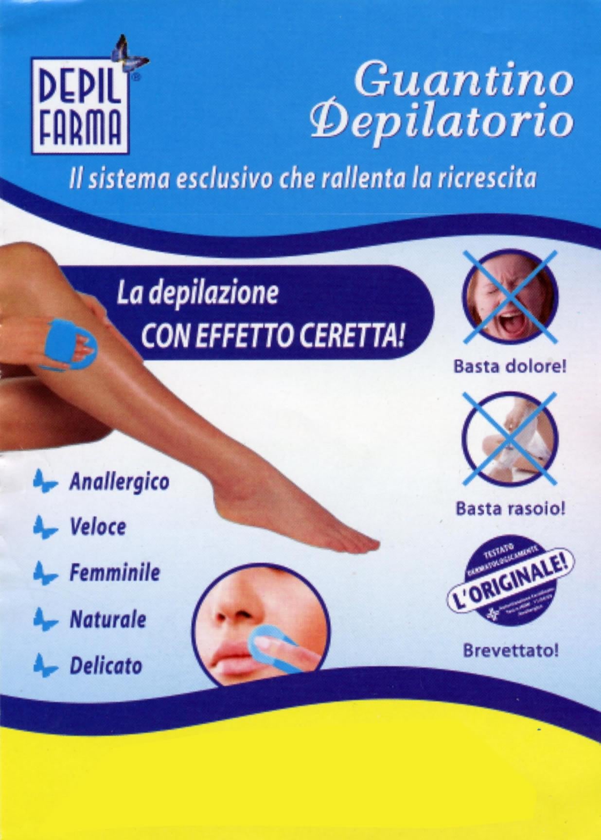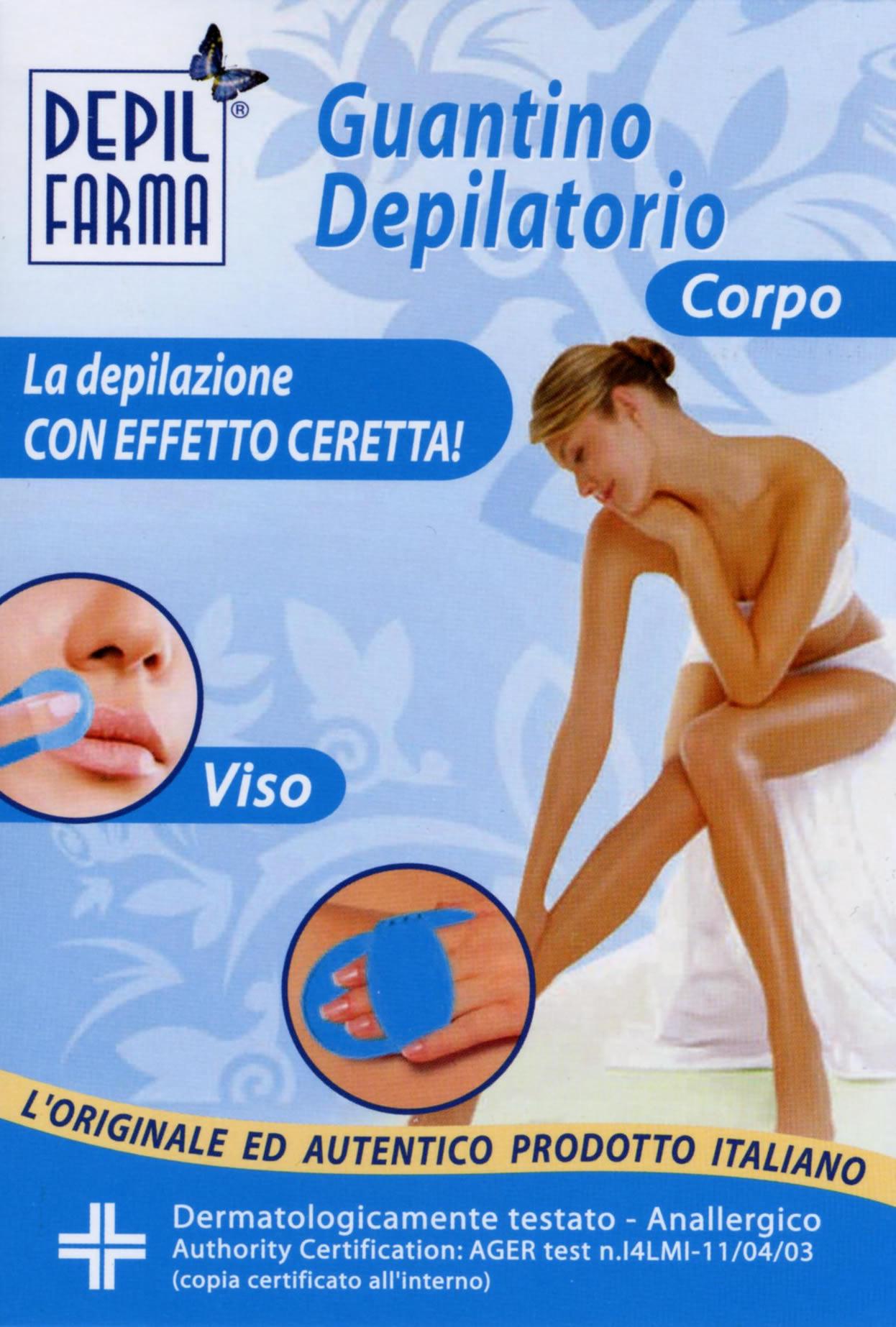 Basta creme, rasoi e dolorose cerette!!! L'unica depilazione che indebolisce la ricrescita. DepilFarma e' l'originale sistema per la depilazione che si avvale di un metodo semplice, veloce, anallergico ma soprattutto indolore. DepilFarma e' studiato per tutte quelle persone che non tollerano prodotti depilatori aggressivi o ad azione chimica, spesso causa di reazioni allergiche (cerette, creme, rasoi, ecc..). DepilFarma non taglia il pelo ma lo rimuove consumando e, se usato regolarmente, ne rallenta la ricrescita eliminando lo spiacevole inconveniente dei peli sottocutanei. DepilFarma esegue inoltre un delicato peeling: insieme ai peli superflui, rimuove le cellule morte dell'epidermide, rendendo la pelle ancora più morbida e sana. Contenuto confezione: 1 guantino corpo con applicato 1 refill 5 ricambi refill corpo dermatologicamente testati 1 guantino viso con applicato 1 refill 5 ricambi refill viso dermatologicamente testati 1 astuccio Istruzioni per l'uso