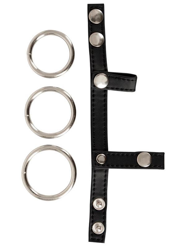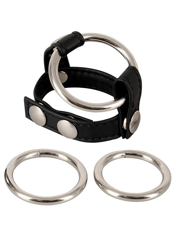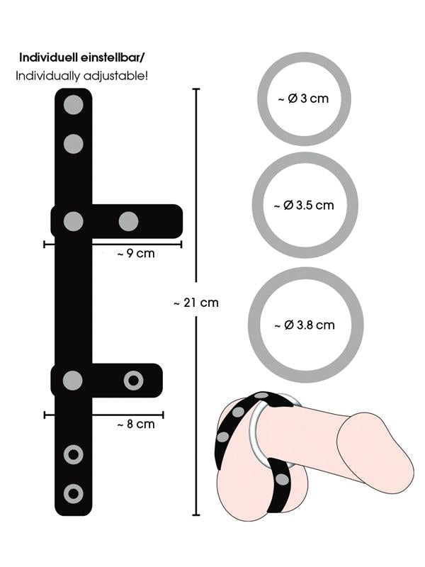 Anello costrittivo in cuoio con piccole borchie, che si applica alla base del pene e dei testicoli, con la possibilità di regolare la larghezza grazie a dei bottoncini a pressione. Inoltre è presente un anello in metallo intercambiabile che stringe il pene . I tre anelli in metallo forniti, sono di diametro 3 cm 3,5 cm e 4cm.