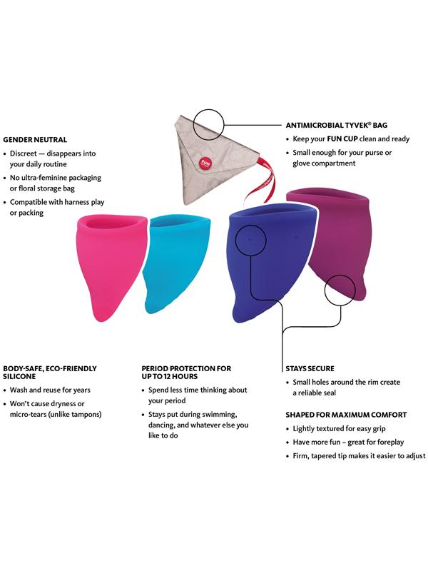 Hai presente quella sensazione di scomodità e disagio quando ti accorgi di aver finito gli assorbenti nel bel mezzo della giornata lavorativa o appena prima di andare a letto? Quella sensazione fa schifo e non ne hai bisogno nella tua vita. La FUN CUP garantisce ore di protezione durante il ciclo e, quando sei pronta, puoi semplicemente lavarla rapidamente e rimetterla a posto. La FUN CUP TAGLIA A più piccola è perfetta per le giornate più leggere. Per i giorni di flusso intenso, o per misure più vestibili, la FUN CUP TAGLIA B è la misura più grande delle nostre due coppette mestruali in silicone e contiene 6 volte più di un assorbente interno. Puoi lavarla e riutilizzarla per anni. Ogni confezione viene fornita con due coppette, quindi puoi tenerne una a casa e portarne una con te in viaggio. - Viene fornita con una borsa antimicrobica - Risparmia su tamponi e assorbenti - Ottima per gli utenti attivi: corri, nuota e balla - Adatta ai preliminari - Ecologica: riduce gli sprechi - Leggermente strutturata per una facile presa - Dura per anni con la dovuta cura - Non porosa e ipoallergenica - Progettata e realizzata artigianalmente in Germania - Materiali sicuri per il corpo, silicone di altissima qualità, grado medico + Hai già abbastanza da fare senza dover affrontare il ciclo tutto il giorno! La FUN CUP ti protegge per ore alla volta, migliora la tua salute sessuale, ti fa risparmiare denaro e ti consente di utilizzare il tuo tempo e la tua energia mentale su qualcosa di più divertente! QUALE CUP DEVO SCEGLIERE? Tutti i corpi sono diversi e scegliere la tua taglia non è una scienza perfetta. Di seguito abbiamo alcuni suggerimenti e, se non sei sicuro, ti consigliamo di iniziare con il KIT ESPLORA. TAGLIA A – Più piccola (5,3 cm; Ø 4 cm; 20 ml) Silicone più rigido per un maggiore controllo durante il posizionamento e la regolazione di una coppetta più piccola Adatto a: flusso più leggero, qualcuno che preferisce qualcosa di più piccolo, donne di età inferiore ai 30 anni che non hanno t parto vaginale. TAGLIA B – Più grande (5,8 cm; Ø 4,3 cm; 30 ml) Silicone più morbido per una vestibilità comoda che trattiene un flusso abbondante senza risultare invadente Adatto a: flusso abbondante, donne che hanno partorito per via vaginale e/o hanno superato il parto 30 anni. KIT ESPLORA (1 TAGLIA A E 1 TAGLIA B) Adatto a: donne che non sono sicure della propria taglia o che desiderano una protezione diversa per le giornate leggere e quelle pesanti. La FUN CUP è modellata per curvarsi con il tuo corpo e lo spessore del silicone varia di conseguenza. Il bordo è più spesso e più solido per mantenerla saldamente in posizione. Anche la punta affusolata è solida, per una facile regolazione. Al centro, il silicone è più morbido e sottile rispetto a quello delle altre coppe, quindi si adatta alla forma del tuo corpo, per il massimo comfort. NON INTERROMPERE NULLA Non dovrai mai più allontanarti durante un turno impegnativo per affrontare la tua situazione mestruale. Non sarai mai più preso dal panico quando ti ritroverai in un bagno senza cestino. La FUN CUP MISURA A contiene 4 volte la capacità di un assorbente interno. Quando è piena, basta tirarla fuori e dargli un rapido lavaggio, ed è pronta per ripartire. Se ti trovi in ??un bagno pubblico con più cabine, basta pulirla con un po' di carta igienica e rimetterla subito dentro. Con un po' di lubrificante, puoi anche metterla prima che inizi effettivamente il ciclo, così la tua bella biancheria intima è protetta . Che tu stia affrontando una lunga giornata di lavoro, godendoti una giornata in spiaggia o ballando con gli amici, la FUN CUP ti dà una cosa in meno di cui preoccuparti. RISPARMIA Se usi gli assorbenti probabilmente spendi più di 50 € all'anno per il ciclo. A 34,90 € per una confezione da due, la FUN CUP TAGLIA A può essere riutilizzata per anni, facendoti risparmiare centinaia di euro. AVERE UN SESSO MIGLIORE DURANTE IL CICLO Gli assorbenti ti lasciano una sensazione appiccicosa. I tamponi ti seccano, lasciando micro-lacerazioni nella tua vagina che ti rendono più suscettibile alle infezioni batteriche e alle malattie sessualmente trasmissibili. La FUN CUP è realizzata in silicone ipoallergenico e non poroso: rimane innocua nella tua vagina finché non la tiri fuori, lasciandoti pronta per il divertimento. Inoltre, è adatta ai preliminari! Senza un filo viscido in mezzo, ti divertirai molto di più con l'orale, indossando un'imbracatura, giocando con un vibratore e persino con le carezze intime più audaci. UN'OPZIONE ECOLOGICA Usi tamponi o assorbenti? Il tuo ciclo creerà fino a 140 chilogrammi di rifiuti nel corso della tua vita. La Terra ti ringrazierà per essere passata alla FUN CUP, che deve essere sostituita solo ogni pochi anni, rendendola praticamente senza sprechi. PORTALA SEMPRE CON TE Porta la tua FUN CUP ovunque tu vada, in una borsa antimicrobica di alta qualità che mantiene la tua coppetta pulita e pronta all'uso e si adatta facilmente alla borsa o al vano portaoggetti.
