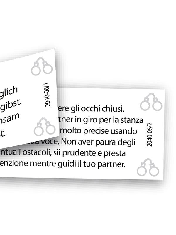 100 sfide stravaganti per le esplorazioni audaci! Un gioco avvincente per te e il tuo partner se sei aperto ad emozionanti esperimenti. O tu o il tuo partner tirate fuori il cuore con le pinzette. Che cosa accadrà? Realizzerai una fantasia segreta o realizzerai un'esperienza completamente nuova? Scopri i confini della tua relazione sessuale e vivi i tuoi momenti più intimi. - Inginocchiati davanti al tuo partner e poggia la tua testa sui suoi piedi. Resta in quella posizione per un minuto in silenzio. Scambiatevi le vostre esperienze. - In una situazione ideale di scontro sessuale, sei tu il controllore o il tuo partner? - Racconta al tuo partner una delle tue fantasie più osé. Scegline una mai provata nella vita reale. Il Cuore Fetish ti porta in un viaggio sessuale ed è incomparabile per qualsiasi altro gioco. Più di 100 compiti e idee viziosi sono contenuti in questa scatola a forma di cuore. Lo stile lucido piacerà a un vasto pubblico e darà un'impressione davvero fetish. Lingua Italiano/tedesco