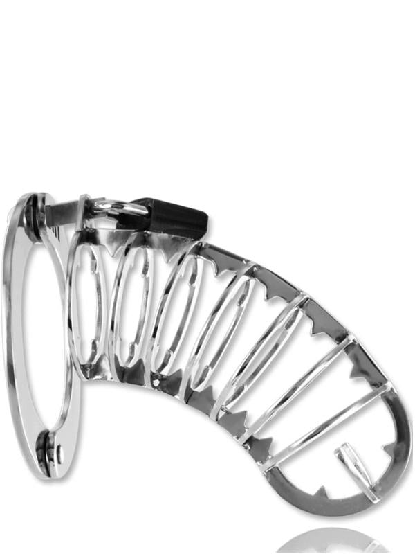 Questo versatile dispositivo è una gabbia, con punte in acciaio inossidabile, creata per essere molto più di un semplice dispositivo di castità. La gabbia di lunghezza superiore alla media è progettata con sette anelli con punte, che iniziano alla base e terminano con quattro punte all'interno dell'estremità del dispositivo. L'anello incluso è regolabile grazie al suo meccanismo di bloccaggio a manetta. La gabbia si fissa ad un anello in acciaio regolabile per mezzo di un singolo perno progettato per mantenere in posizione la serratura inclusa. Lucchetto e chiavi sono inclusi