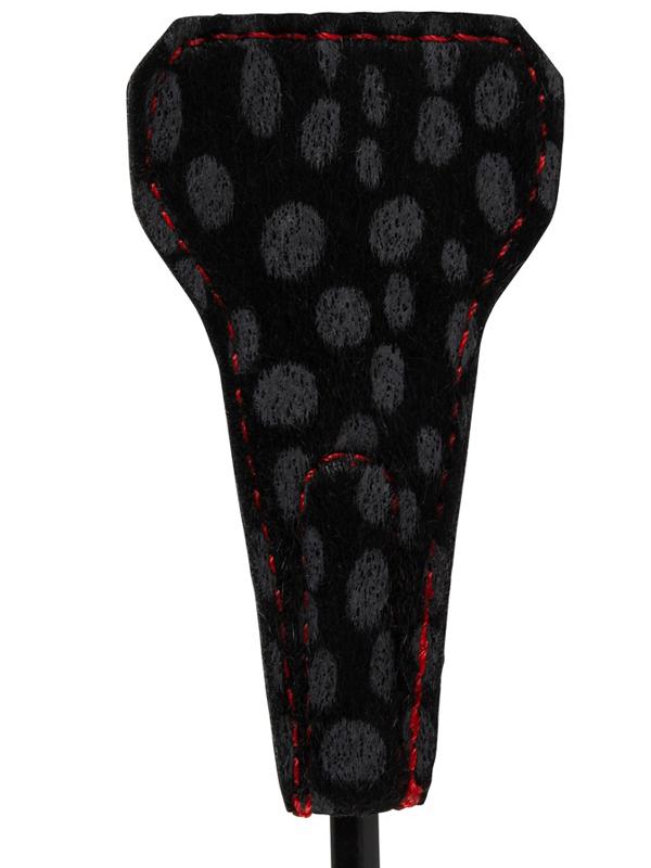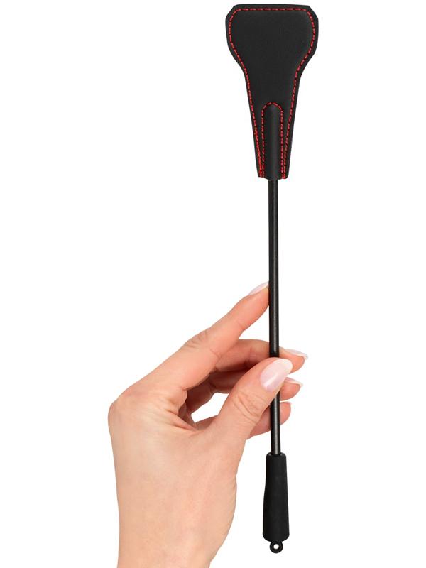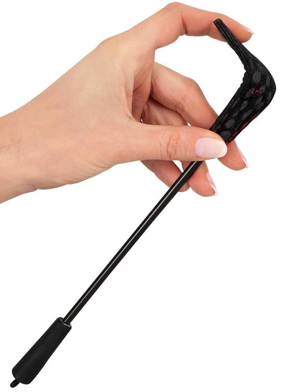 Frustino nero con finiture in pelliccia ecologica e cuoio, rifinito con cucitore rosse lungo i bordi. Per argomenti potenti! Piccola frusta nera con paletta. Un lato in pelle, l'altro in finta pelliccia. Cucitura rossa. Lunghezza totale 25 cm. Poliuretano, poliestere, asta: policloruro (vinile).