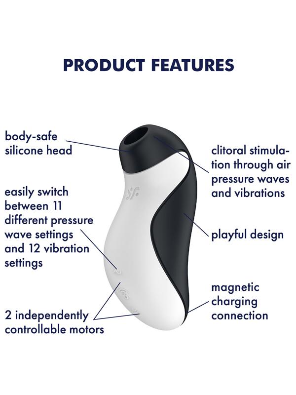 Quelli di Satisfyer, dopo aver regalato al mondo il pinguino succhiaclitoride hanno brevettato un altro sistema superiore che mette insieme i famosi risucchi e ci aggiunge le pulsazioni e le vibrazioni di aria. Una rivoluzione, credimi. Ecco quindi a te il succhiaclitoride 2.0: succhia, schiaffeggia, vibra e pulsa IN CONTEMPORANEA! Stu pen do. Dal produttore: Chi è che nuota nel letto con te? Il simpatico Satisfyer Orca ti vizierà con potenti vibrazioni e sensuali onde di pressione: 2 potenti motori rendono possibile questo miracolo. UCCIDIMI DOLCEMENTE Orca assassina, ma stai scherzando? Il simpatico vibratore a onde di pressione mordicchia delicatamente la tua perla e, come al solito, completamente senza contatto! Grazie al suo aspetto adorabile, Orca è particolarmente adatta a chi non ha esperienza con i giocattoli dell'amore o come regalo. Ma non lasciarti ingannare dal suo aspetto innocente, perché la piccola creatura marina è potente e spietata! ANIMALE DI TALENTO Chi ha l'Orca è in dubbio: onde di pressione o vibrazioni? La piccola Orca può fare entrambe le cose, ovviamente entrambe allo stesso tempo! Puoi scegliere tra 11 intensità di onde di pressione e 12 programmi di vibrazione e trasportarti sulle onde del piacere verso l'orgasmo. Il suo corpo sottile realizzato in silicone delicato sulla pelle ti consente di mantenere sempre il controllo di ciò che sta accadendo. Informazioni aggiuntive 2 motori Impermeabile (IPX7) Silicone medico I programmi possono essere controllati separatamente 2 in 1 - onde di pressione e vibrazioni