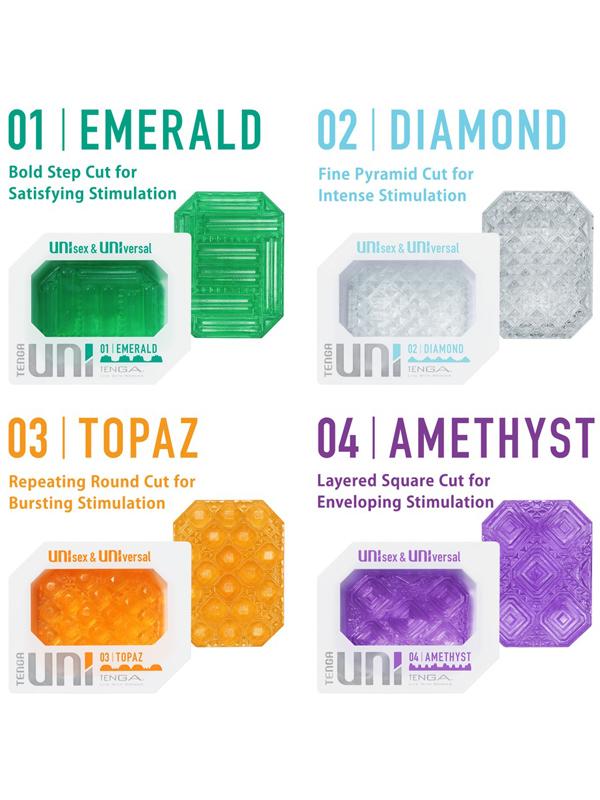 Pene, clitoride, ano, vagina... goditelo dove ti pare! UNIsex, UNIversale, ecco UNI Masturbatore e guaina per le dita in uno Incredibile massaggio per il pene e la vagina Pronto a partire: lubrificante incluso Molto elastico e flessibile TPE morbido come la seta UNIsex e UNIversale! Il flessibile e morbido masturbatore UNI Amethyst di Tenga può essere utilizzato anche come stimolante manicotto per le dita! Un lato è liscio, l'altro ha un'emozionante struttura, studiata per un massaggio intensivo del pene, della clitoride e della vagina. La guaina setosa e ultraflessibile è facile da rivoltare e viene utilizzata insieme al lubrificante incluso durante i giochini con mani e dita. Ametista: Con un'emozionante trama quadrata Topaz ha un'eccitante texture nodosa Diamante ha una struttura piramidale spigolosa Smeraldo ha una struttura scanalata angolare per un massaggio tonificante 1 pezzo monouso (la versione kit ha 4 pezzi). Lunghezza totale 6 cm (altamente estensibile). Se vuoi saperne di più, leggi il post Masturbatori Tenga UNI - Domande e Risposte sul nostro blog.